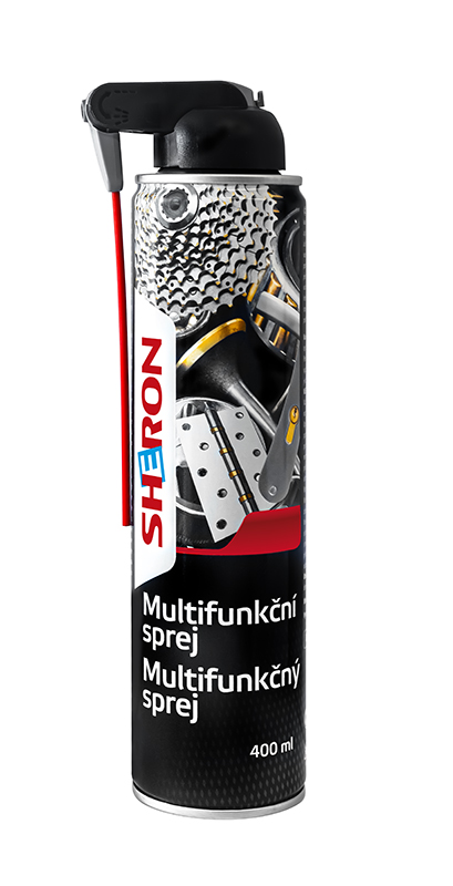 SHERON Multifunkční sprej čistí, chrání, maže, penetruje a odpuzuje vlhkost. Svým složením je stejný jako po generace známé univerzální mazivo. Aplikuje se na lehce zatížené řetězy, upínače, zámky, nářadí, zahradní nástroje, stroje, spojovací materiály (závity, šrouby a matice), pedály, rotopedy, brusle i skateboardy.