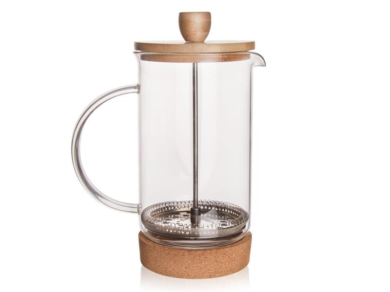 - Materiál: borosilikátové sklo (max 180 °C), nerez, bambus, korek (odnímatelná část)