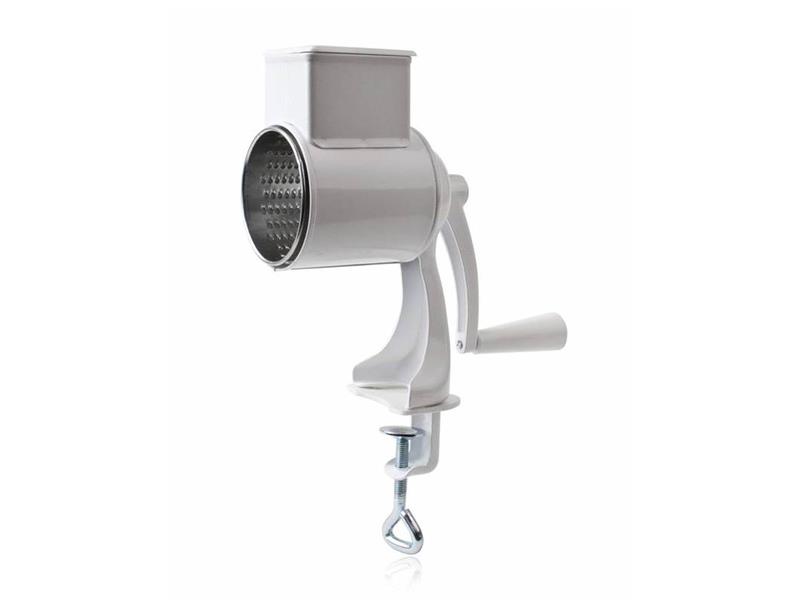 Mlýnek na strouhanku o celkové výšce 30,5 cm, buben z pocínovaného plechu s průměrem 7,5 cm, kovové tělo mlýnku je ošetřeno práškovou barvou v bílém odstínu. Vyrobené v České republice.