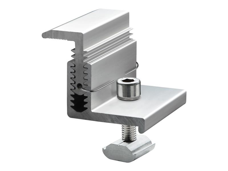 Sada koncových příchytek pro montáž 4 fotovoltaických panelů stříbrné barvy. Vertikální a horizontální instalace fotovoltaických panelů.