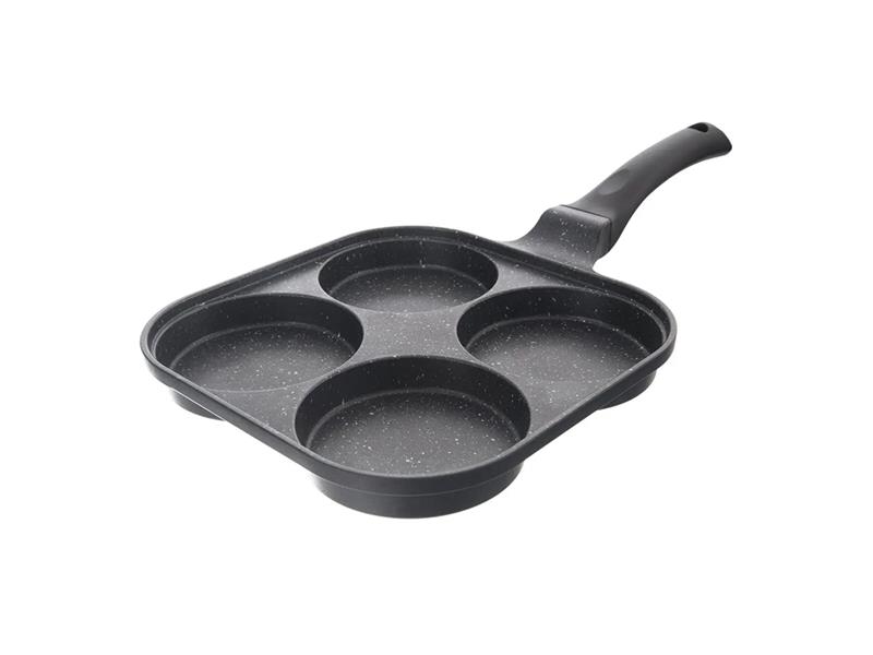 Hranatá pánev na volská oka/lívance je odlévaná masivní pánev se 4 sekcemi a s velmi kvalitním nepřilnavým povrchem PFLUON GRANIT. Je určena pro přípravu sázených vajec, bramboráčků, lívanečků atd. s minimální potřebou tuku. Dostatečně hluboké sekce 1,7 cm. Materiál: hliník s vynikajícím nepřilnavým povrchem PFLUON GRANIT a s profilovaným dnem, plast (bakelit). Možnost zavěšení.