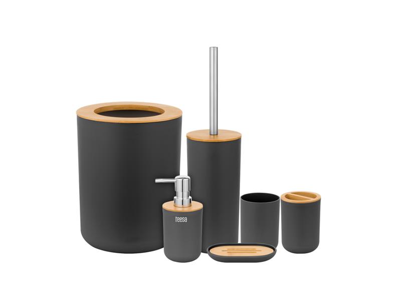 Obsah sady: dávkovač mýdla, koupelnový kelímek, kelímek na zubní kartáčky, misku na mýdlo, WC kartáč, odpadkový koš