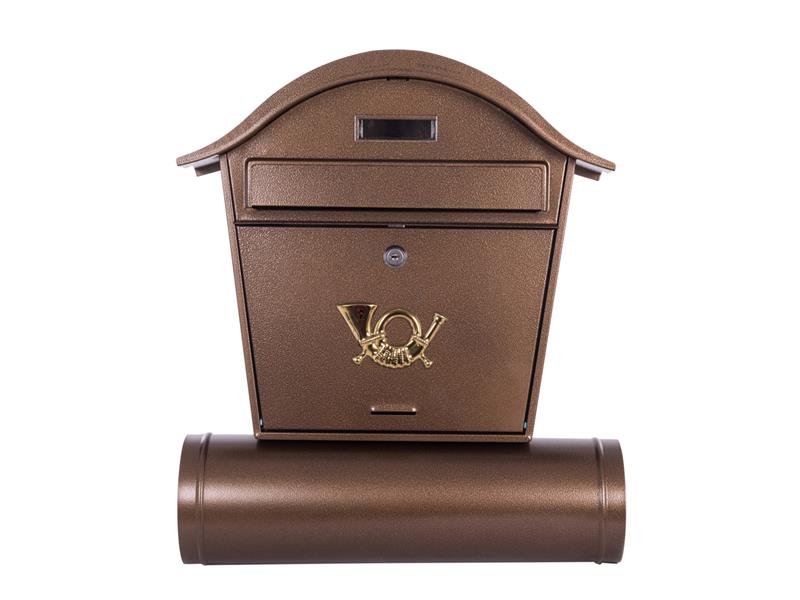 Tradiční poštovní schránky vyrobená z oceli. - Oblá stříška- Tubus na tiskovinyTechnické parametry:- Rozměry (šxvxh): 400 × 480 × 105 mm- Barva: bronzová