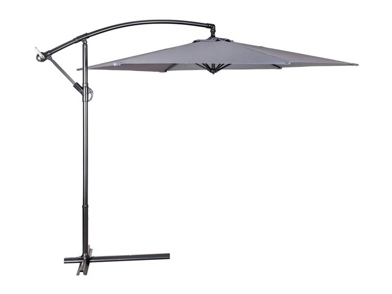 Závěsný slunečník průměr 300 cm má 6 ocelových žeber 12 x 18 mm, je vyrobený z polyesteru 160 g / m2. Pevná ocelová tyč má průměr 4,8 cm. Stojan, který je součástí výrobku je možno zatížit betonovými dlaždicemi pro zvýšení celkové stability. Otevírání slunečníku se provádí kličkou. Navíjecí systém má plastové pouzdro s kovovým navíjecím mechanismem - kovová klička, kovová hřídel a kovový pastorek s kovovou závlačkou. Barva šedá.