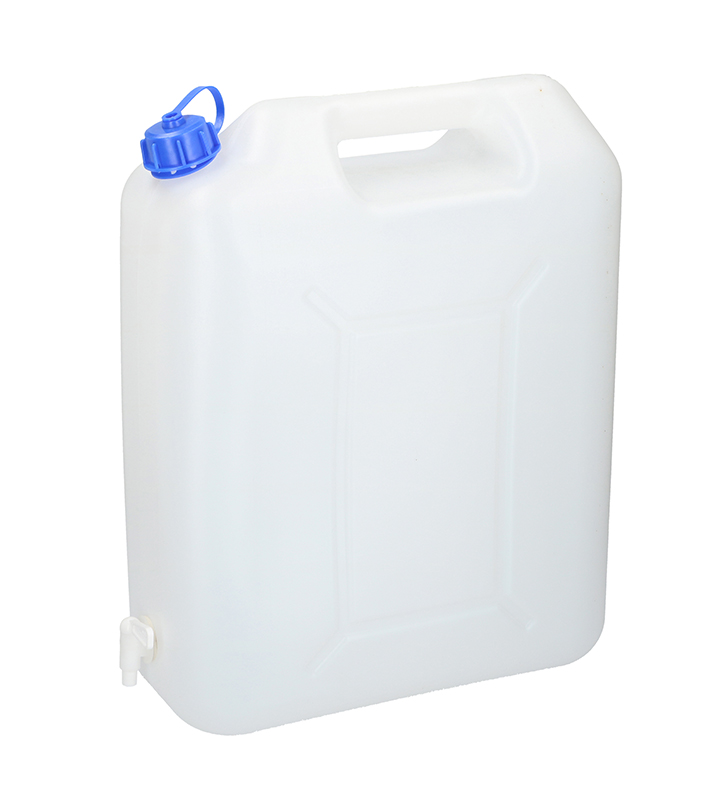 Kanystr HDPE určený k uchování pitné vody. Se spodním výpustným kohoutem, uzávěr s gumovým těsněním.