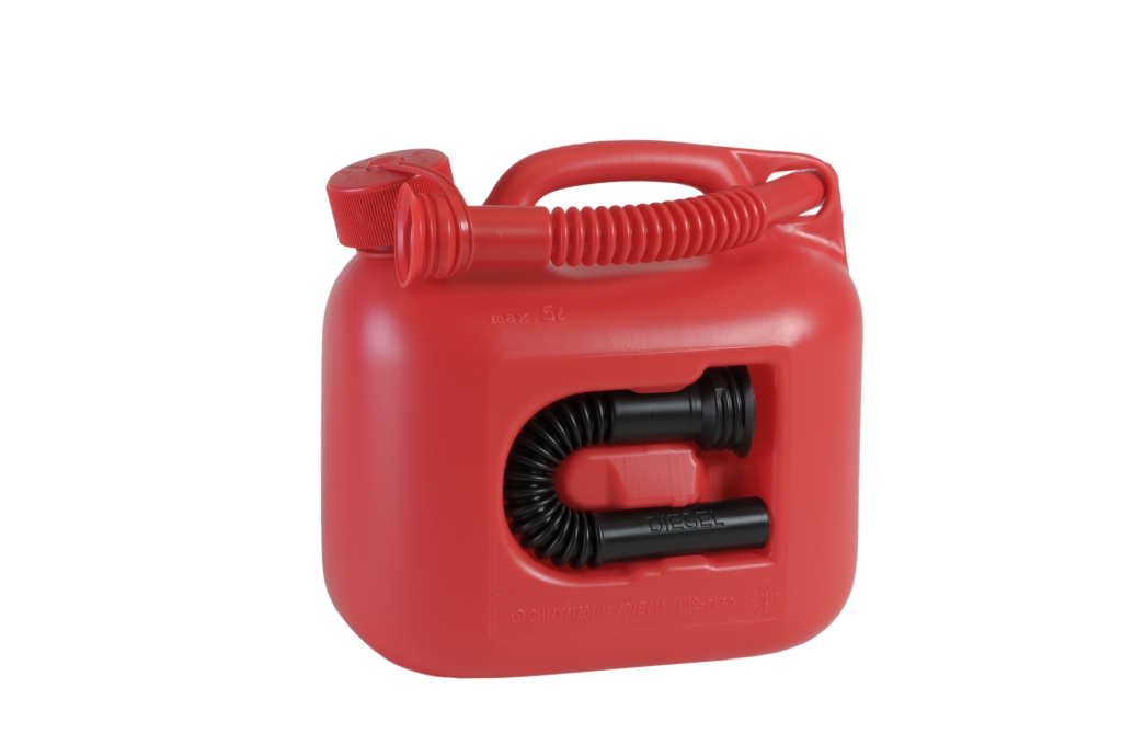 Plastový kanystr na PHM s nalévací trubkou integrovanou v těle nádoby.