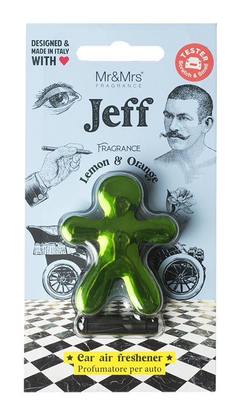 Jeff osvěžovač do auta pocházející z italské rodiny tradičních značek jako Cesare nebo Little Joe. Jeff kombinuje moderní design, luxusní vzhled a praktičnost - uchycení do ventilační mřížky pomocí plastového klipu, který je součástí balení.