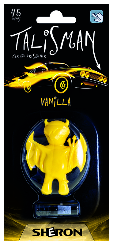 SHERON Talisman je trendy osvěžovač vzduchu vyrobený z moderních polymerních hmot a vonných olejů. V autě se umisťuje do ventilační mřížky pomocí plastového klipu. Provoní interiér vozidla po dobu 45 a více dní.