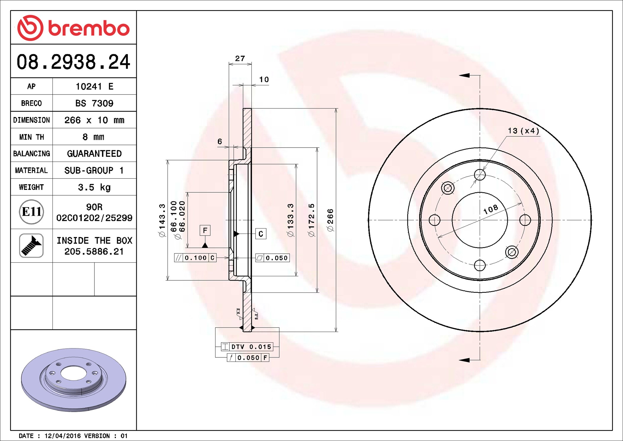 BREMBO 08.2938.24 - Brzdový kotúč