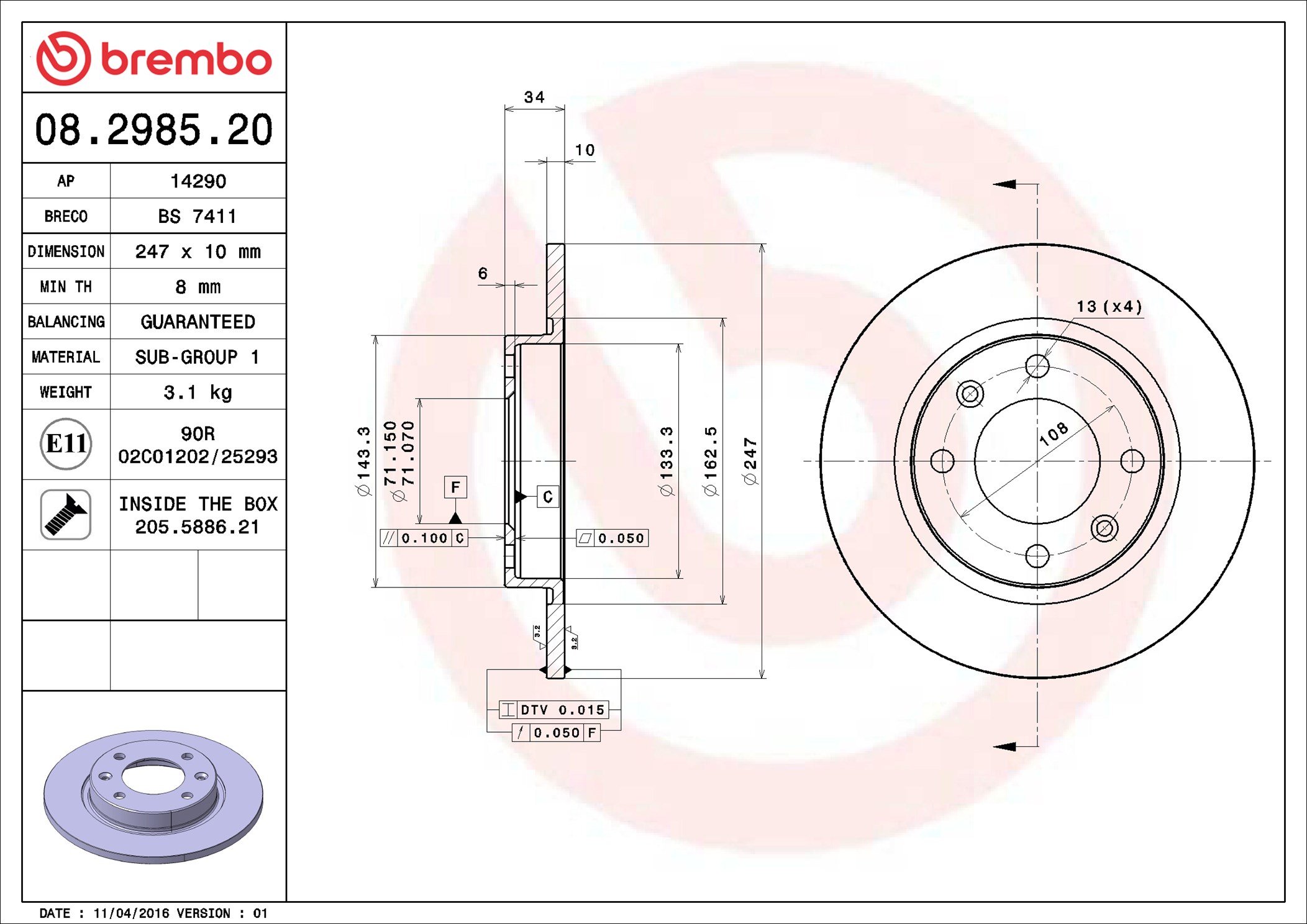 BREMBO 08.2985.20 - Brzdový kotúč