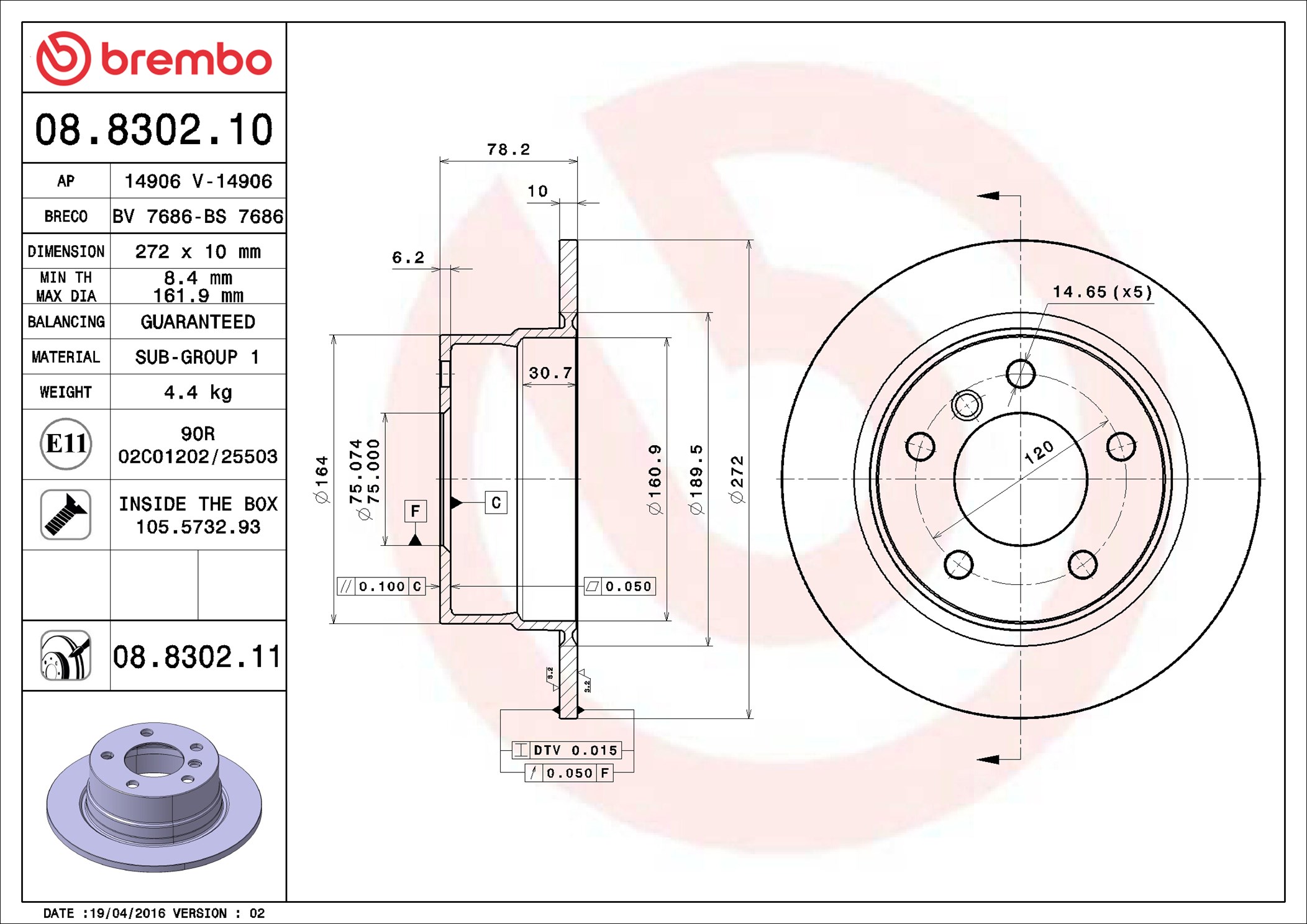 BREMBO 08.8302.11 - Brzdový kotúč