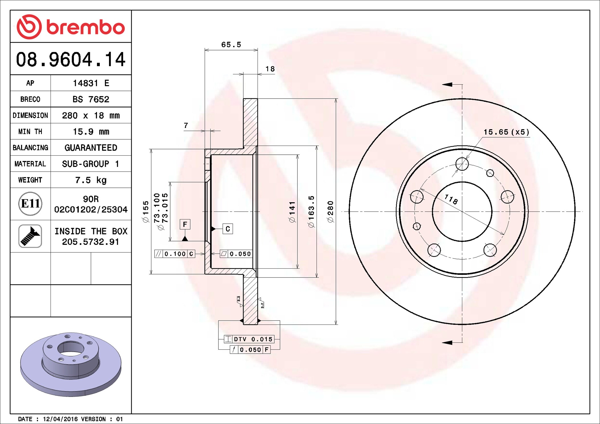 BREMBO 08.9604.14 - Brzdový kotúč