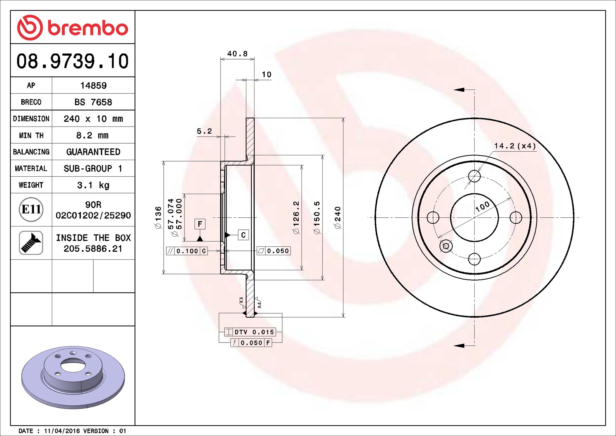 BREMBO 08.9739.10 - Brzdový kotúč