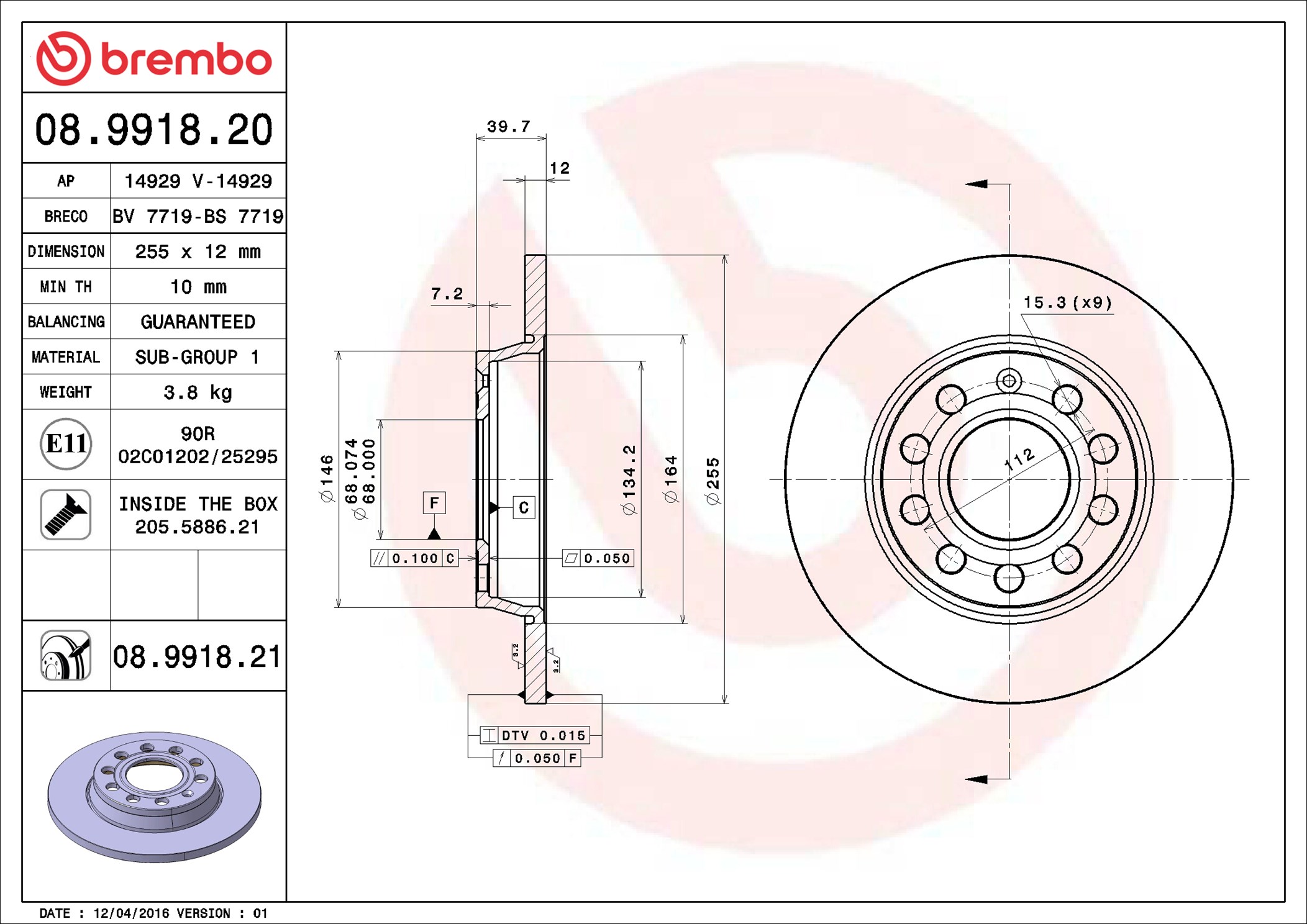 BREMBO 08.9918.21 - Brzdový kotúč