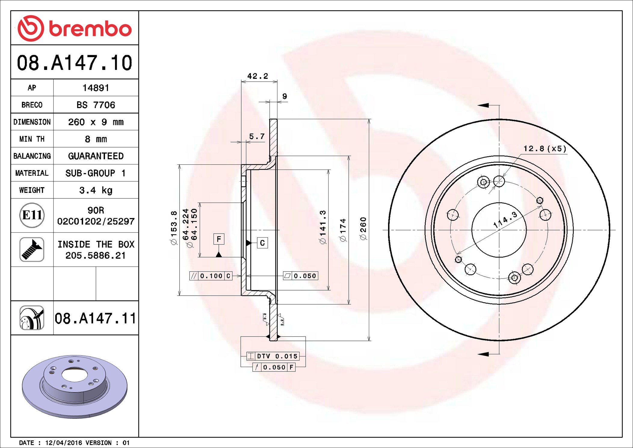 BREMBO 08.A147.11 - Brzdový kotúč
