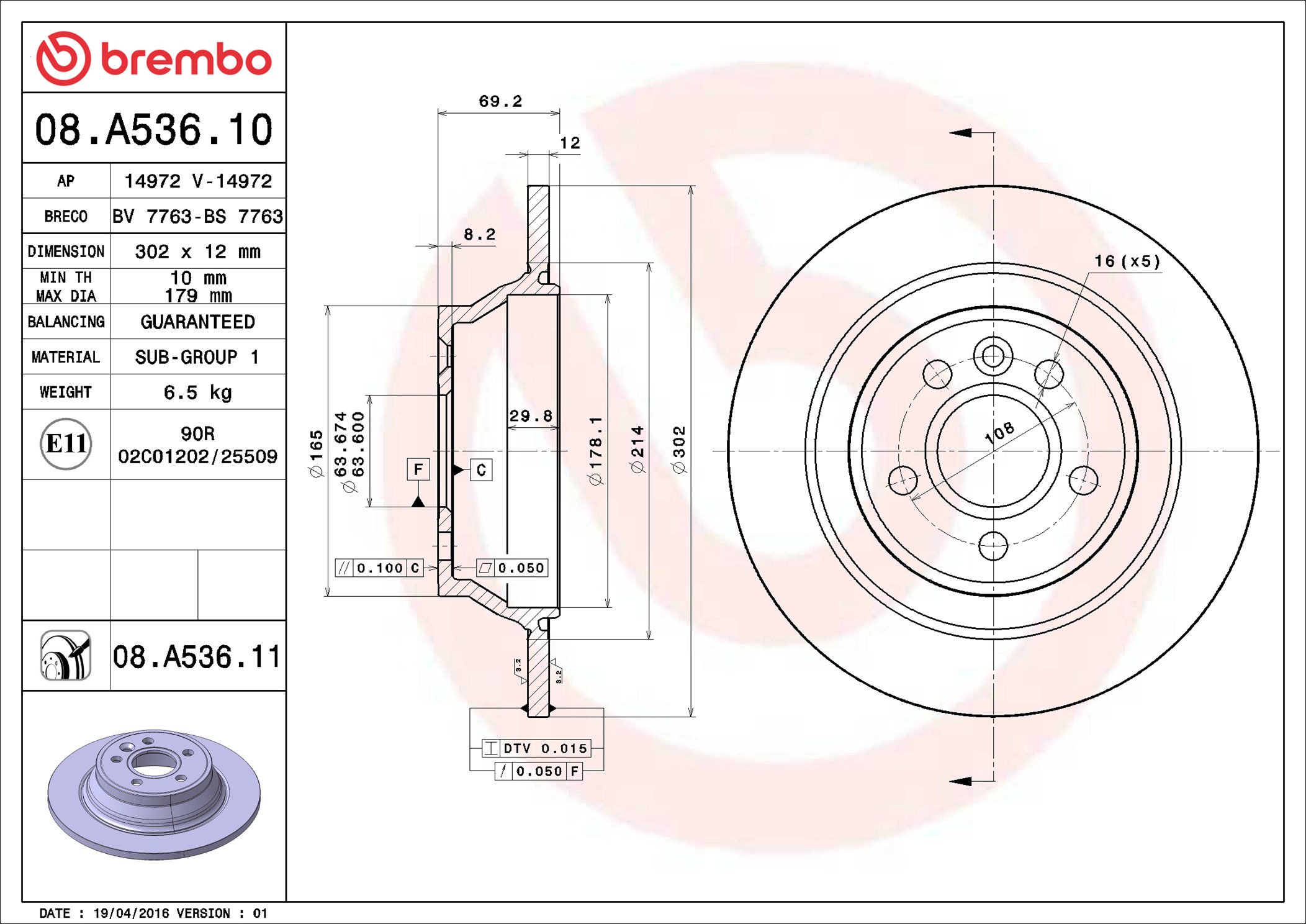 BREMBO 08.A536.11 - Brzdový kotúč