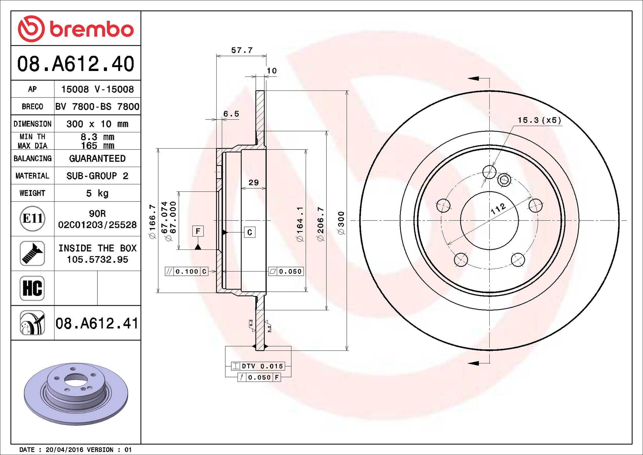BREMBO 08.A612.41 - Brzdový kotúč