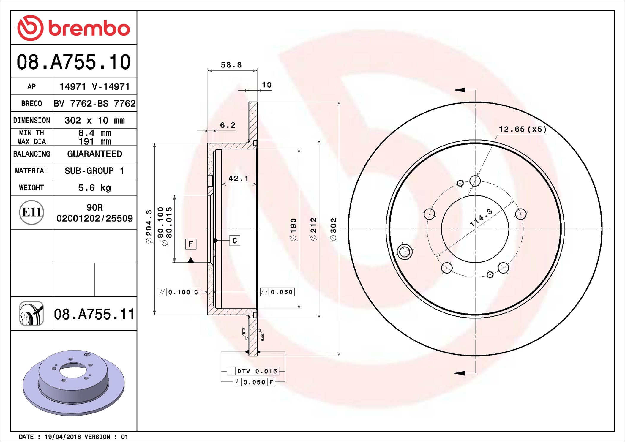 BREMBO 08.A755.11 - Brzdový kotúč