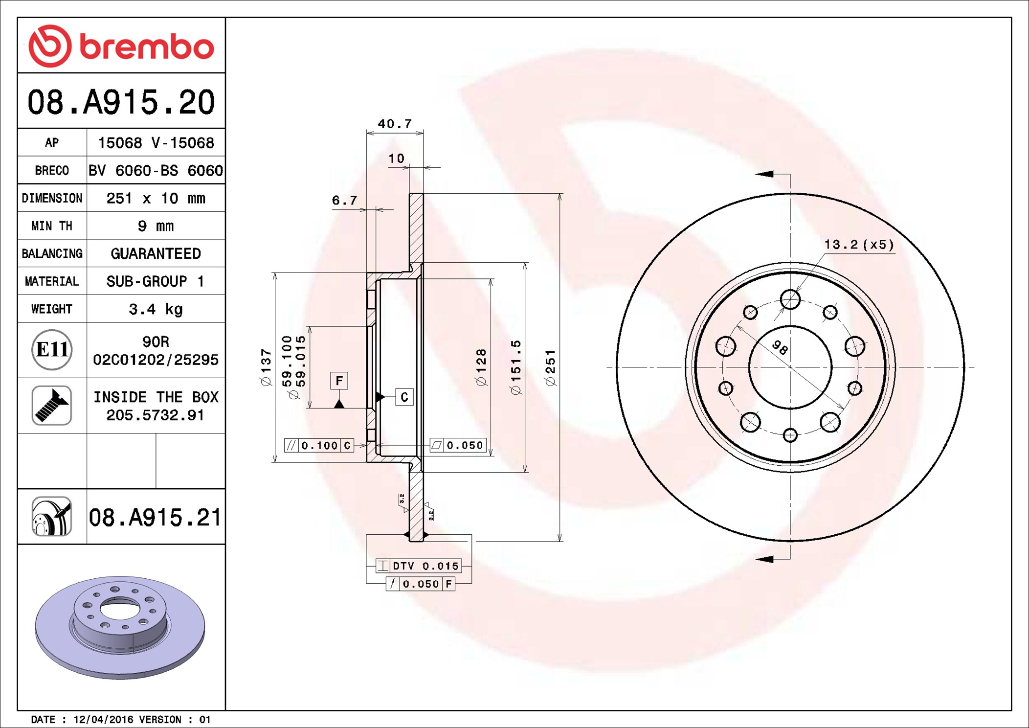 BREMBO 08.A915.21 - Brzdový kotúč