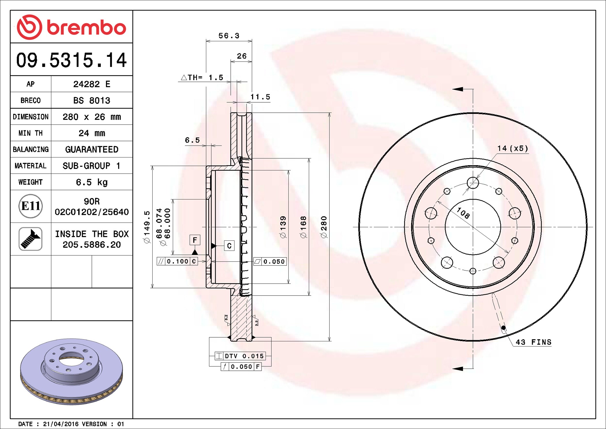 BREMBO 09.5315.14 - Brzdový kotúč