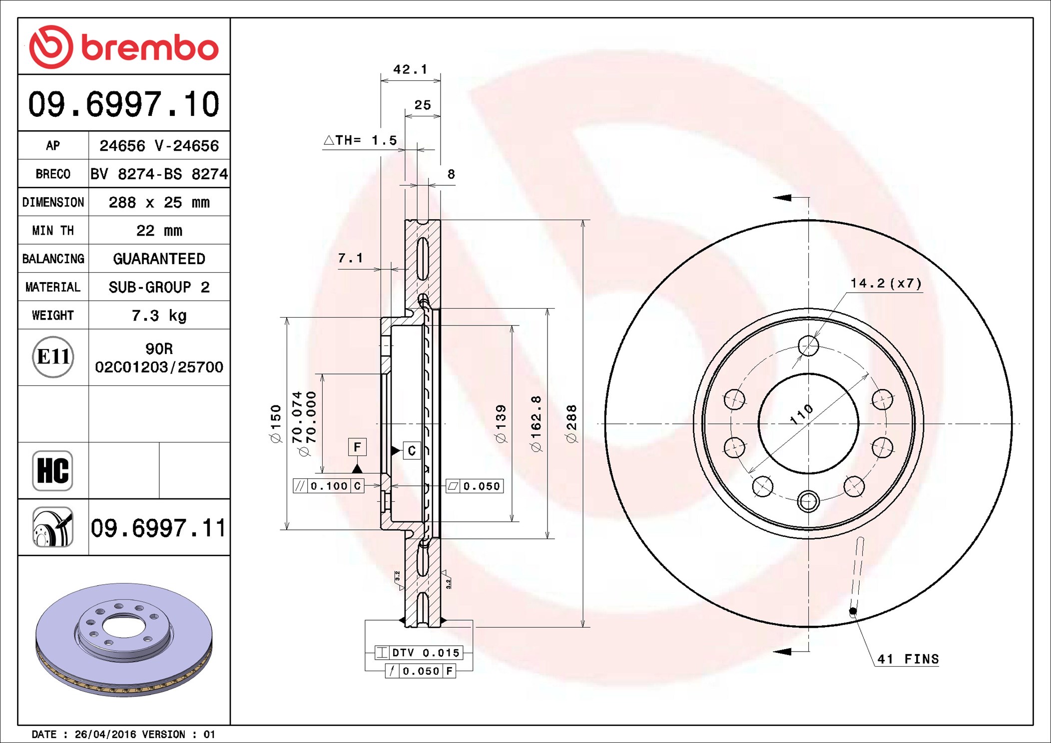 BREMBO 09.6997.11 - Brzdový kotúč