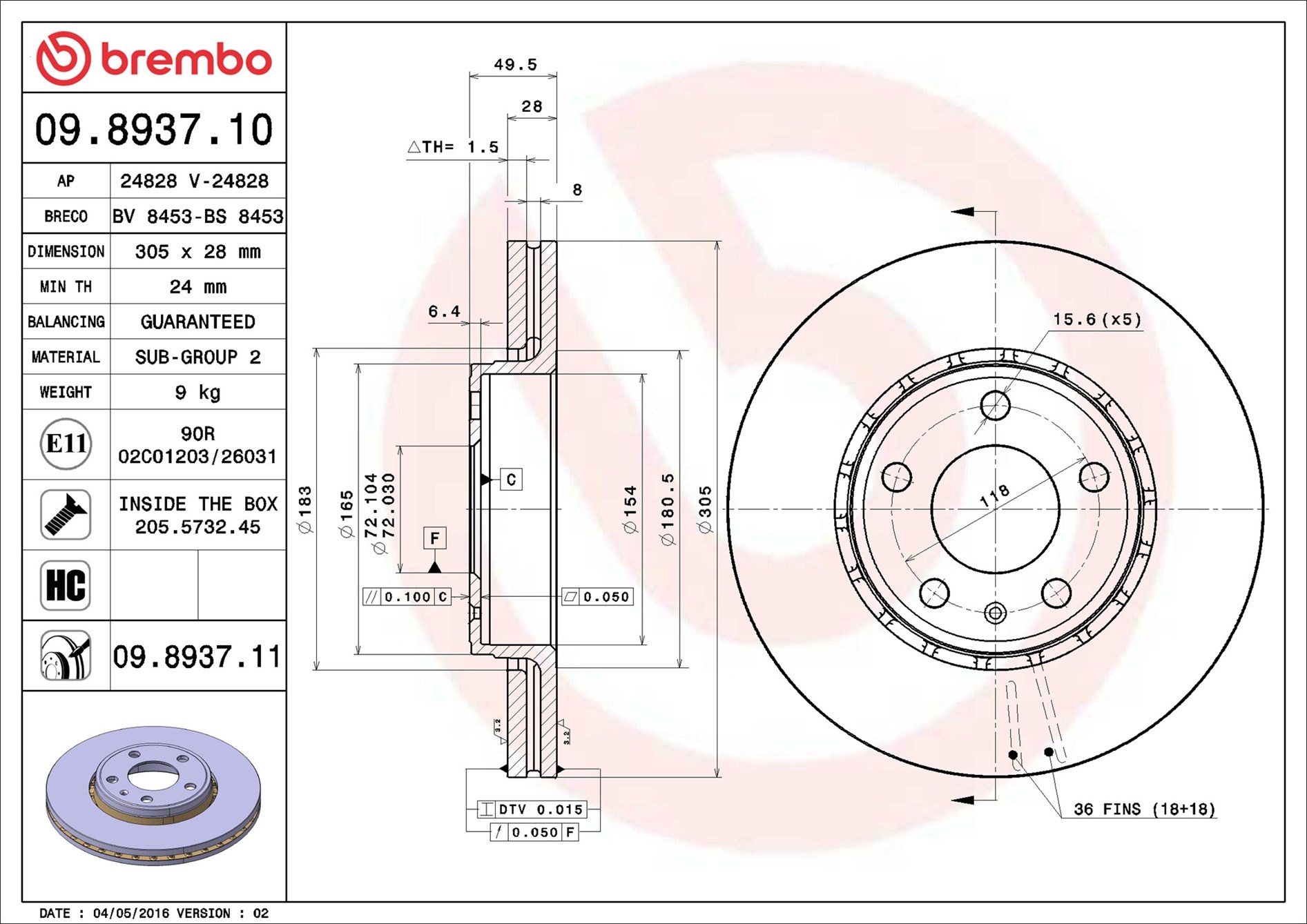 BREMBO 09.8937.10 - Brzdový kotúč