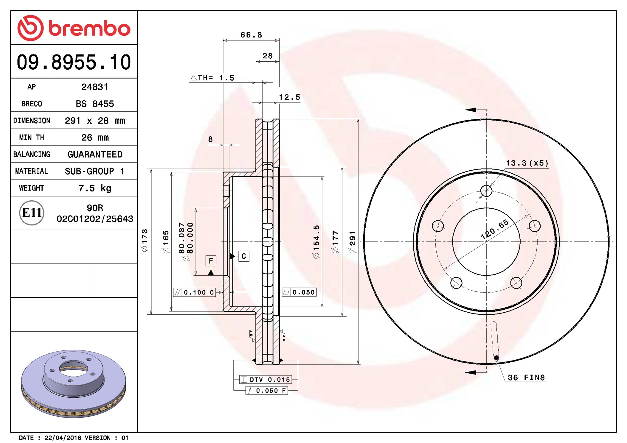 BREMBO 09.8955.10 - Brzdový kotúč