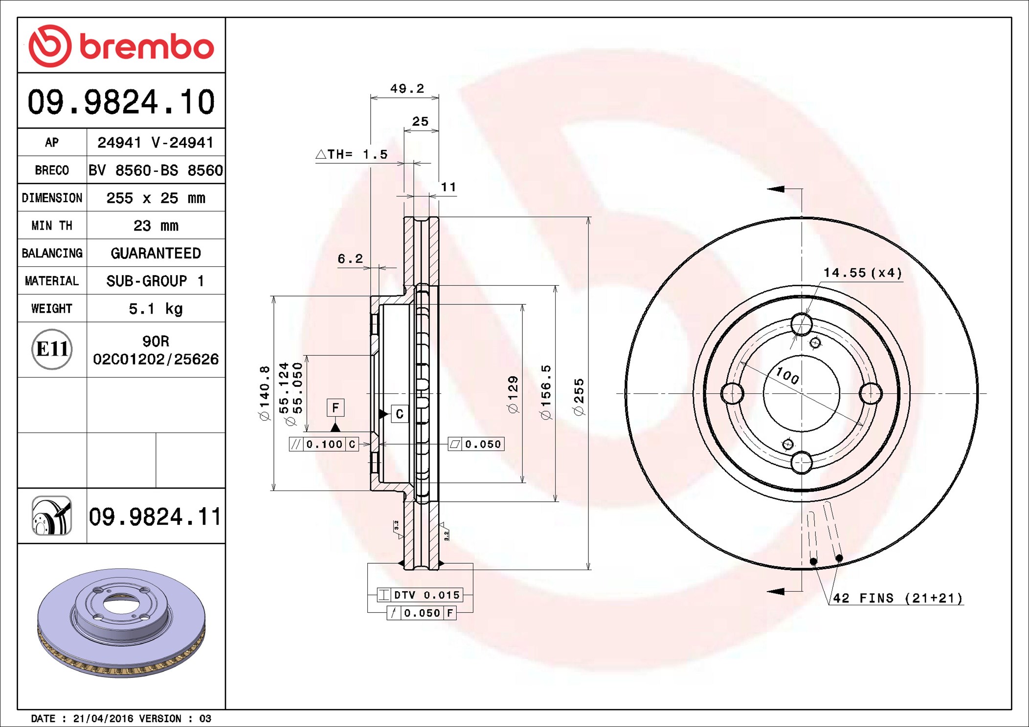 BREMBO 09.9824.11 - Brzdový kotúč