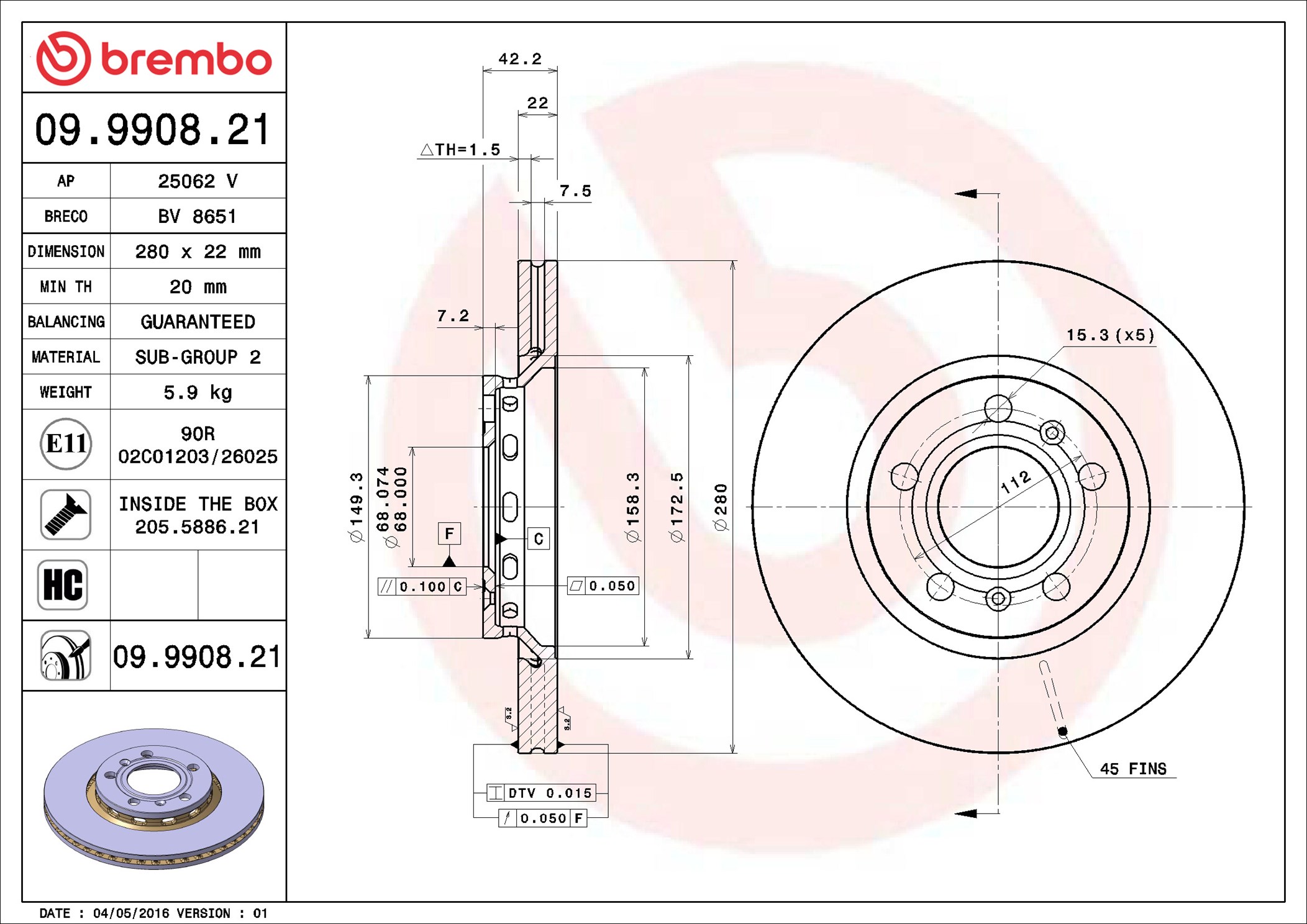 BREMBO 09.9908.21 - Brzdový kotúč