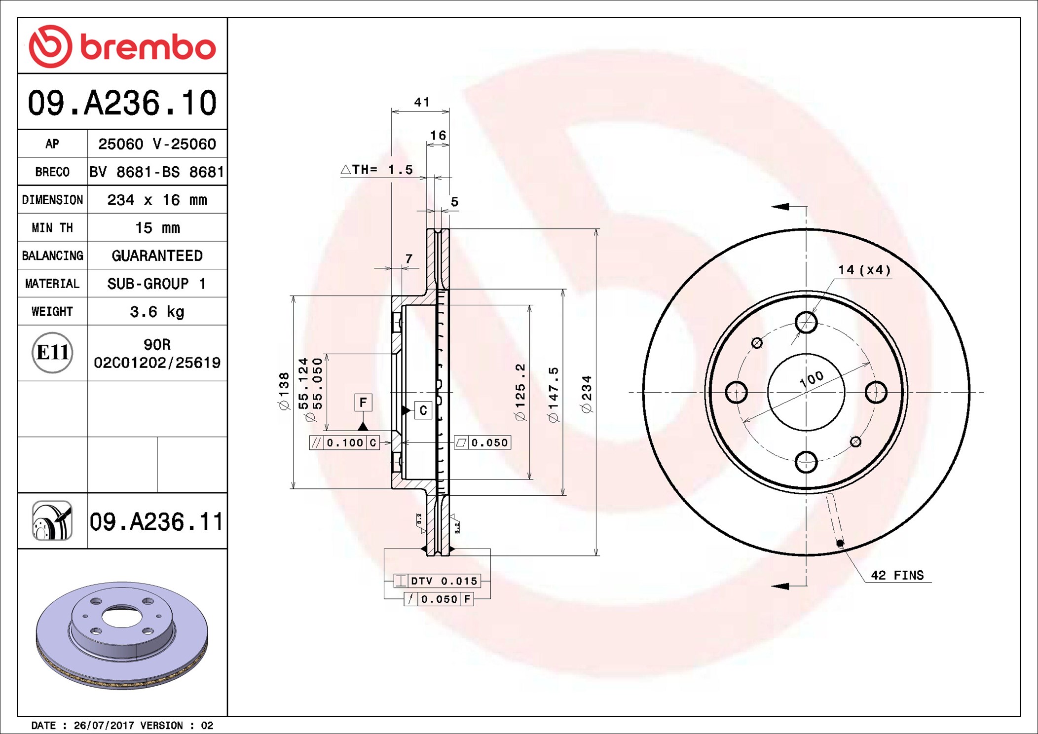 BREMBO 09.A236.11 - Brzdový kotúč
