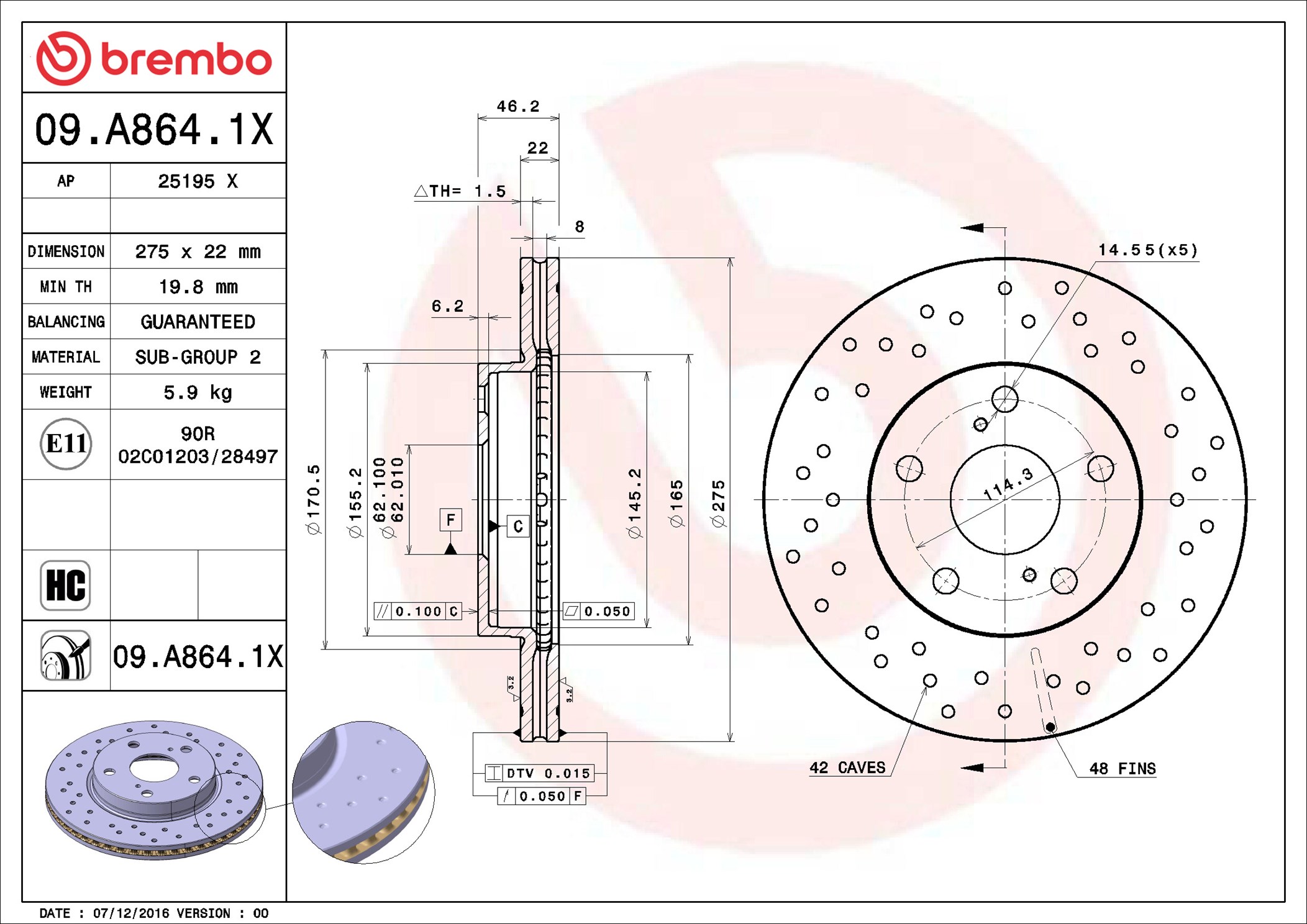 BREMBO 09.A864.1X - Brzdový kotúč