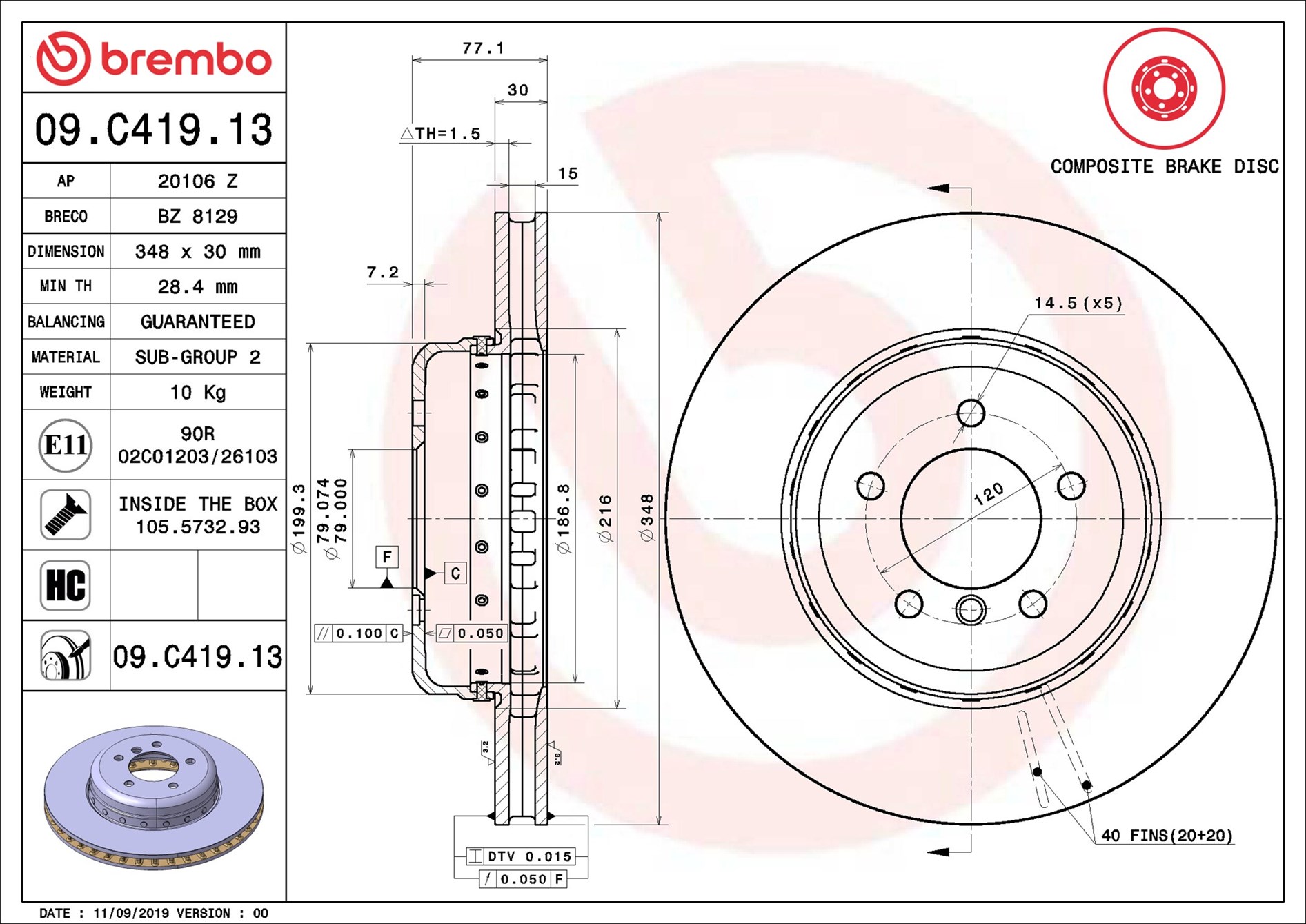 BREMBO 09.C419.13 - Brzdový kotúč