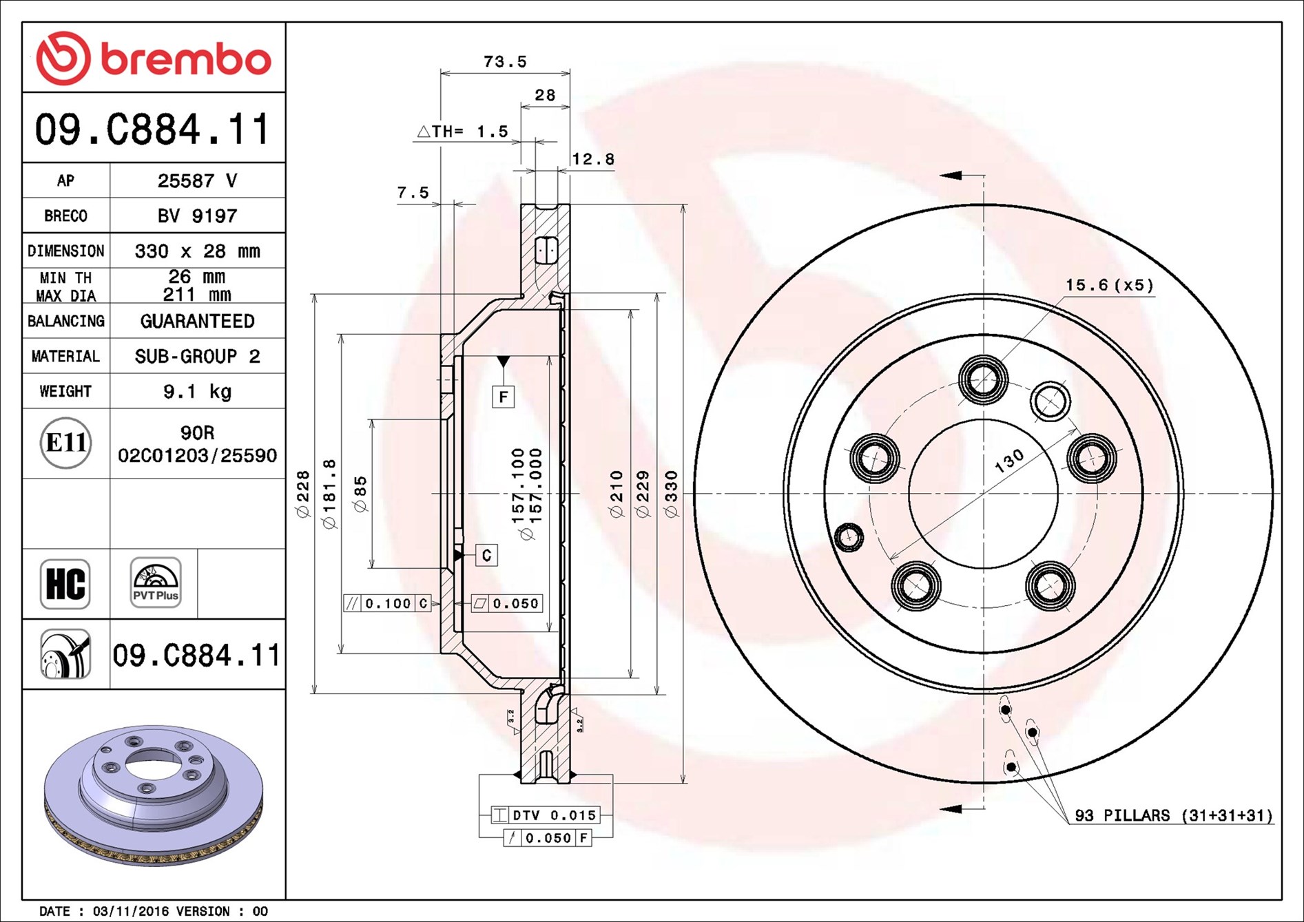 BREMBO 09.C884.11 - Brzdový kotúč