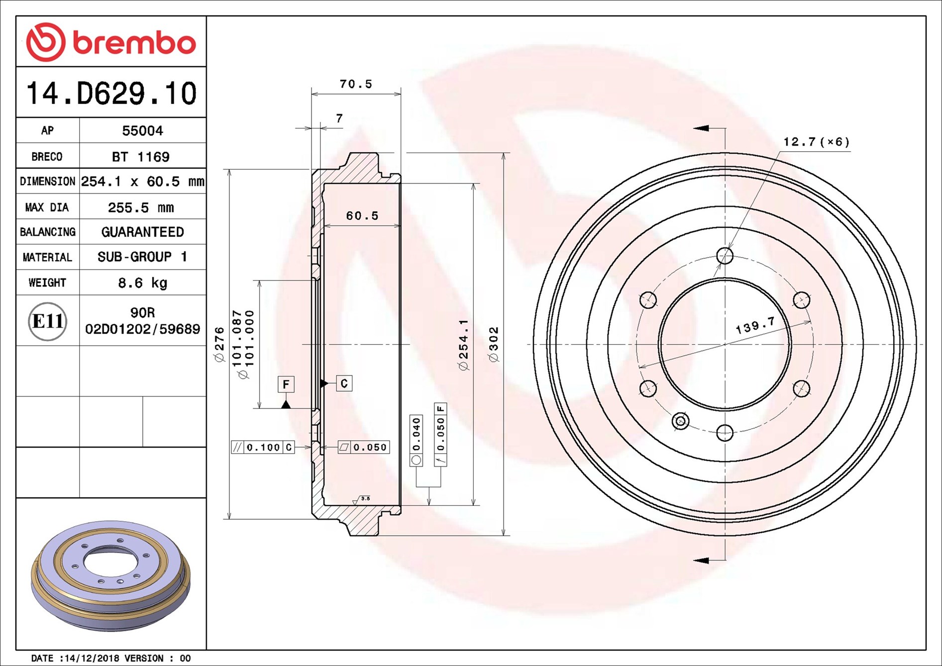 BREMBO 14.D629.10 - Brzdový bubon