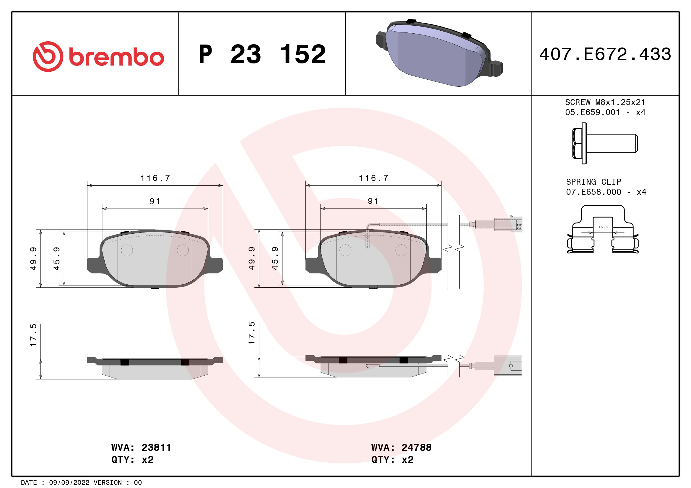 BREMBO P 23 152X - Sada brzdových platničiek, vždy 4 kusy v sade