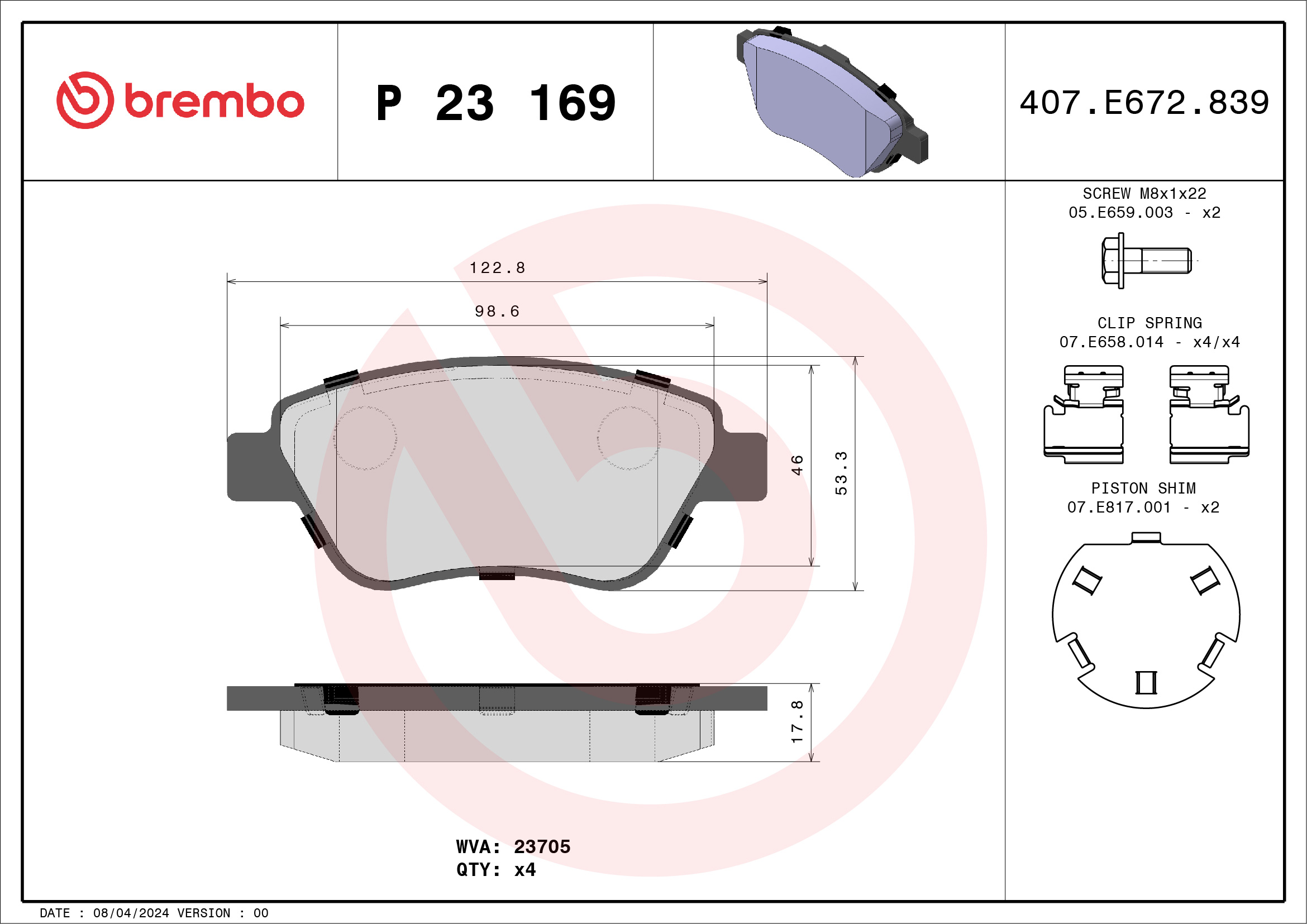 BREMBO P 23 169 - Sada brzdových platničiek, vždy 4 kusy v sade