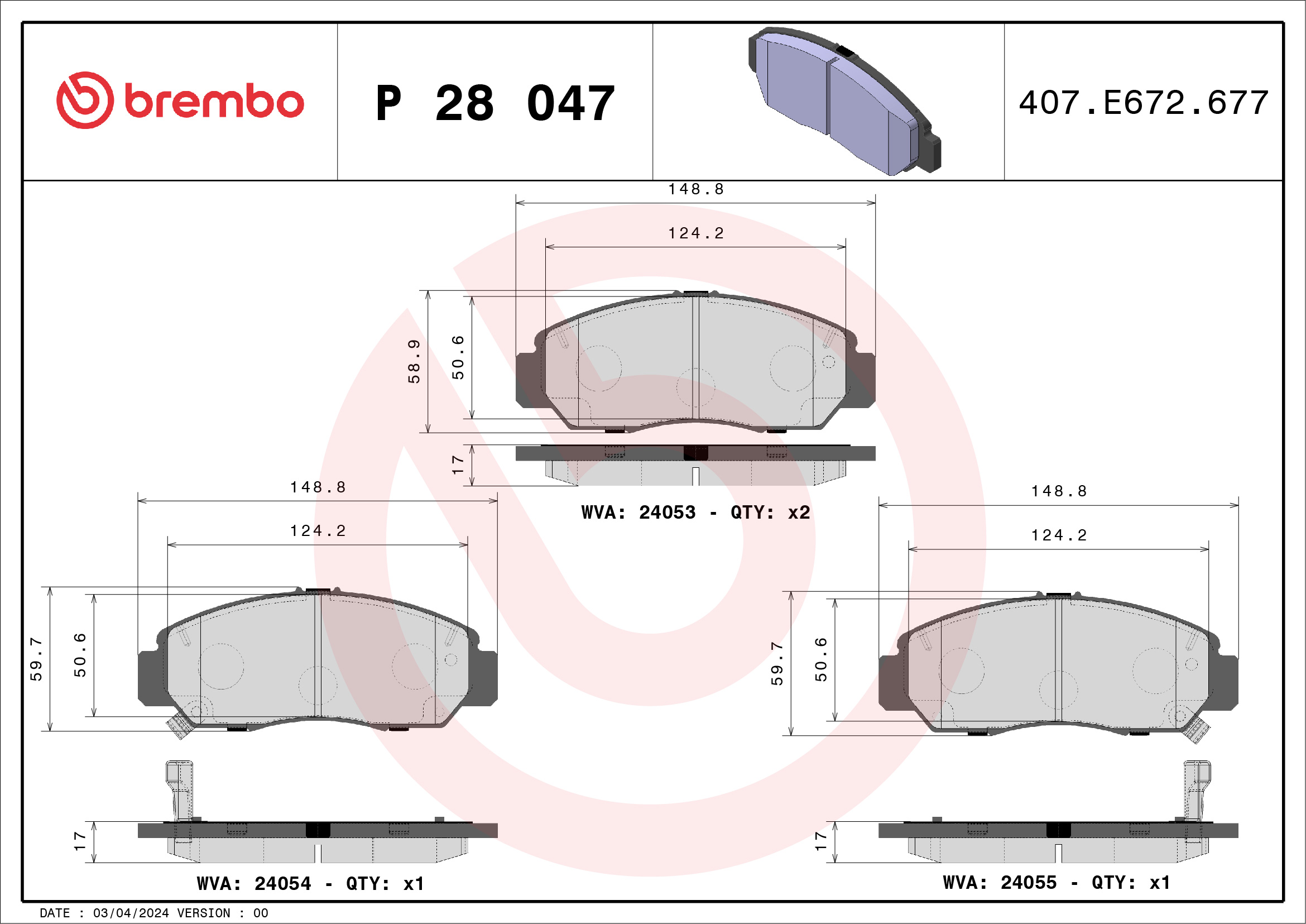 BREMBO P 28 047 - Sada brzdových platničiek, vždy 4 kusy v sade