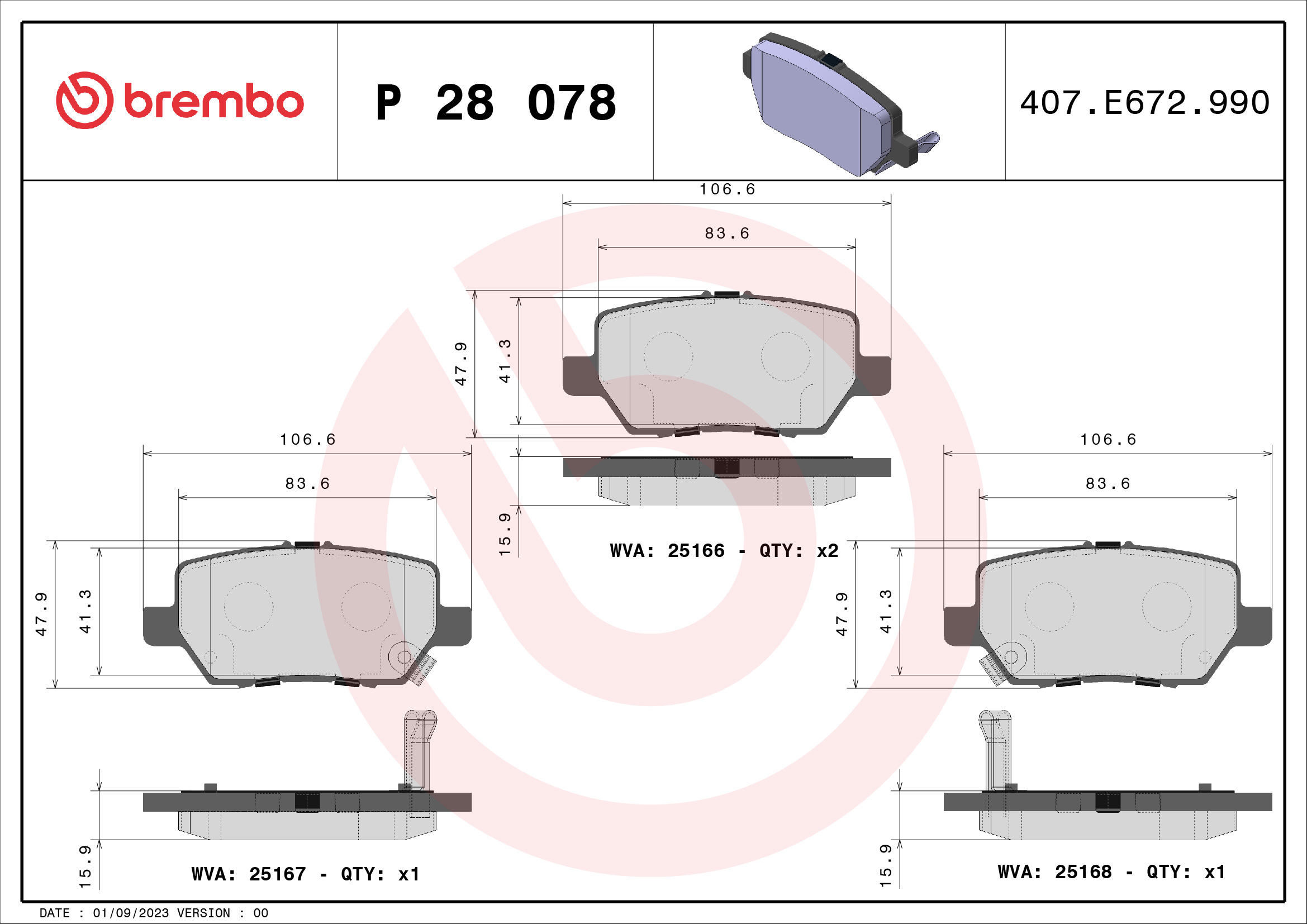 BREMBO P 28 078 - Sada brzdových platničiek, vždy 4 kusy v sade