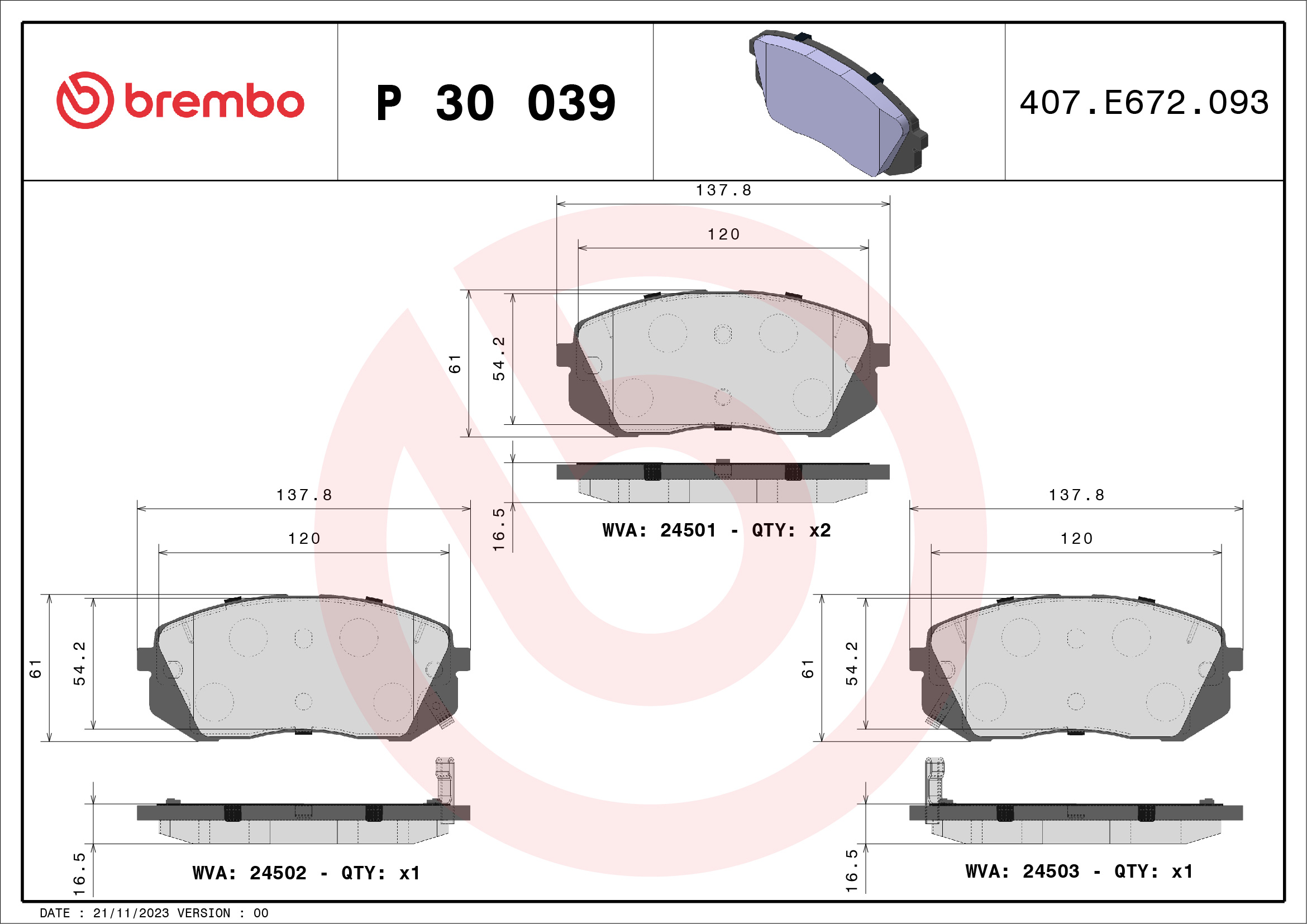 BREMBO P 30 039 - Sada brzdových platničiek, vždy 4 kusy v sade