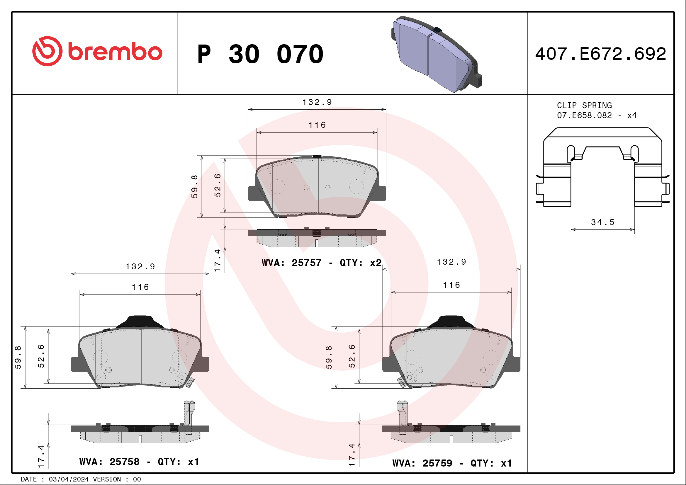 BREMBO P 30 070 - Sada brzdových platničiek, vždy 4 kusy v sade
