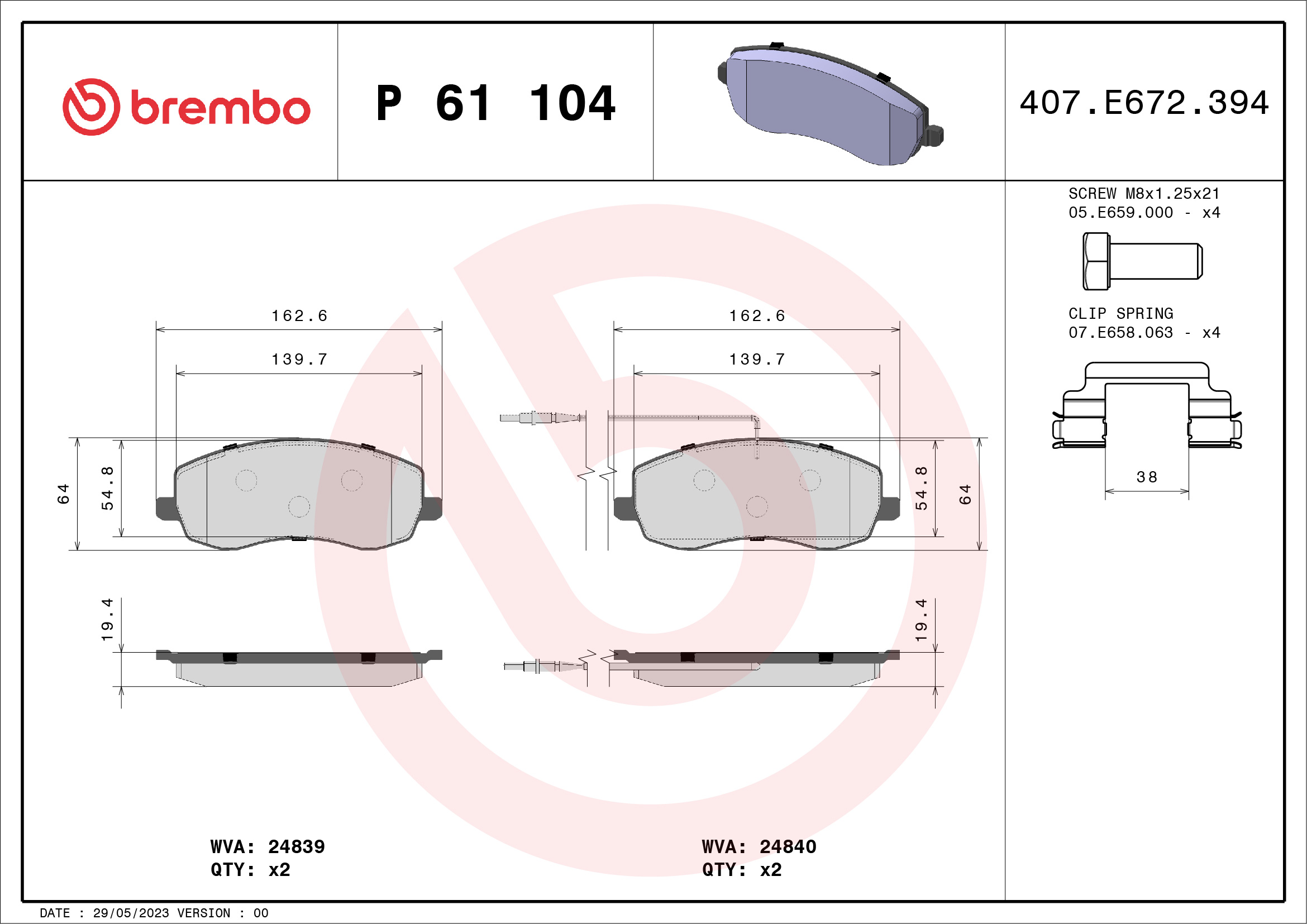 BREMBO P 61 104 - Sada brzdových platničiek, vždy 4 kusy v sade