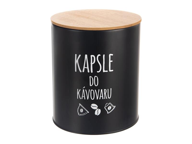 Dóza s víčkem na uložení kávových kapslí do kávovarů. Technické parametry:- Materiál: plech, bambus, silikon – těsnění- Rozměry: pr. 16 cm, v. 18,5 cm
