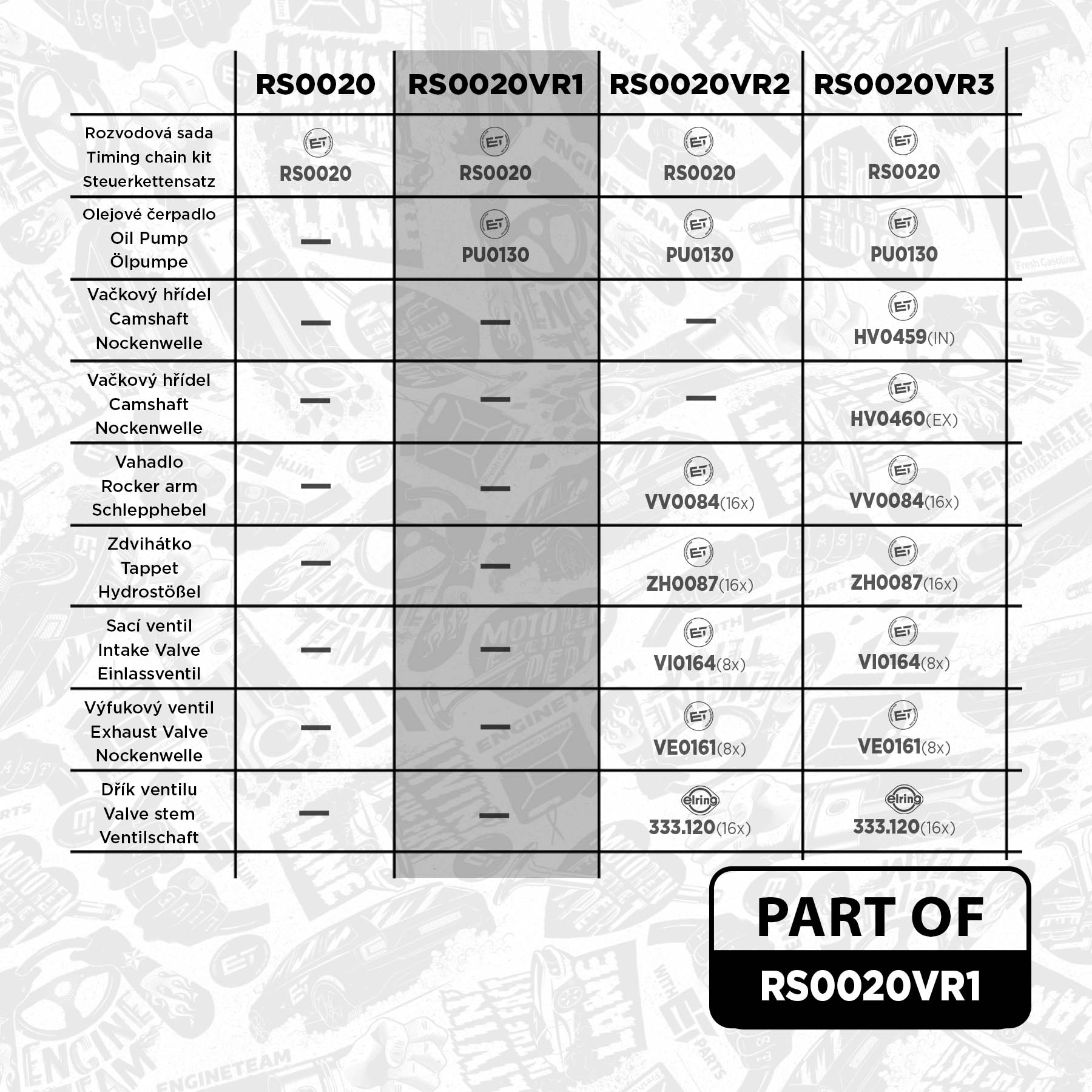 ET ENGINETEAM je uznávaná značka špecializujúca sa na výrobu náhradných dielov a komponentov pre motory, ktorá ponúka vysoko kvalitné produkty pre rôzne druhy vozidiel. Značka je obľúbená medzi profesionálnymi mechanikmi a autoservisami vďaka svojim spoľahlivým, trvácnym a cenovo dostupným výrobkom, ktoré sú nevyhnutné pre optimálny výkon a životnosť motora. [Viac tu]