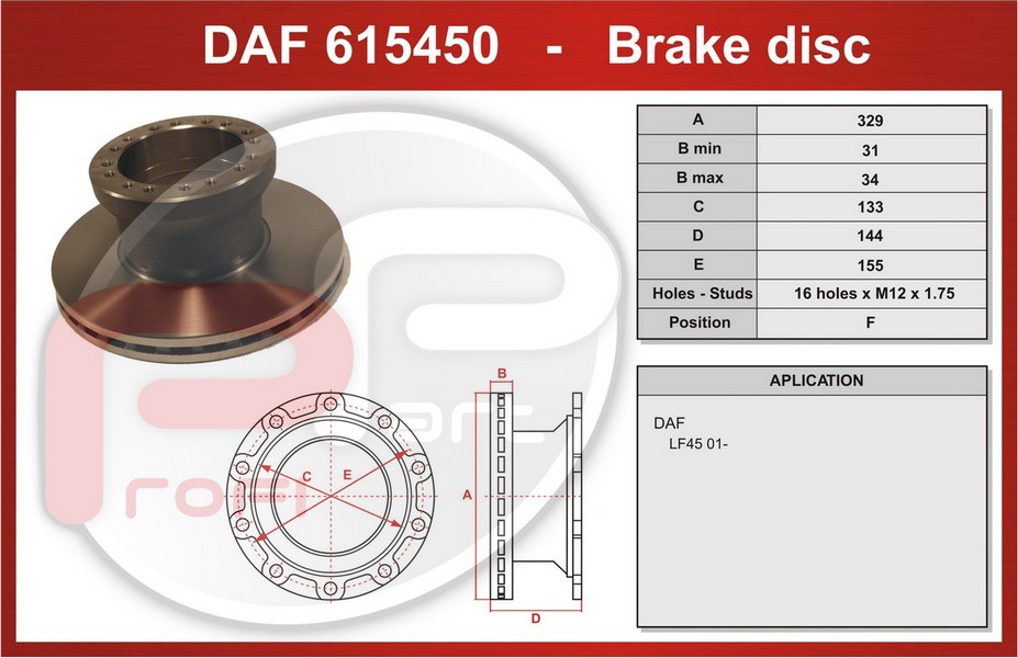 DAF615450 - kotouč brzdový DAF LF45 pevný kroužek ABS - Profi Part, 329x133x144x155