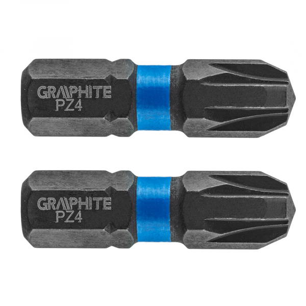 Rázové bity, typ PZ4, celková délka 25 mm, ocel S2, pohon 1/4', 2 ks. Rázové bity GRAPHITE (obj. č. 56H506) Typ PZ4, celková délka 25 mm, jsou robustní bity určené pro použití s větším krouticím momentem pomocí šroubováků nebo rázových utahováků. Vyrobeno z vysoce kvalitní oceli S2, která má zvýšenou pružnost a odolnost proti mechanickému poškození. Torzní z?na, která se otáčí při vysokém točivém momentu, snižuje přenos síly, čímž se zvyšuje odolnost bitu proti zlomení a několikanásobně se prodlužuje jeho životnost. Pracovní konec bitu zaručuje dokonalé uchycení. Značka GRAPHITE nabízí širokou škálu elektrického nářadí, které vyhovuje potřebám profesionálů.