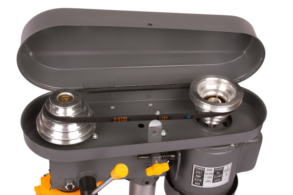 Praktická stolní stojanová vrtačka, určená k vrtání kovů, dřeva nebo plastů pro domácí hobby dílny. Vrtačka má výkon 350W, který lze zpřevodovat do 5 rychlostních stupňů. Rychlostní stupně nastavujeme za pomoci klínového řemene, upnutého v hlavě vrtačky (Vřeteníku) mezi kola s různými průměry. Možné rychlostní stupně: 580 / 850 / 1220 / 1650 / 2650 ot. za min. naprázdno.