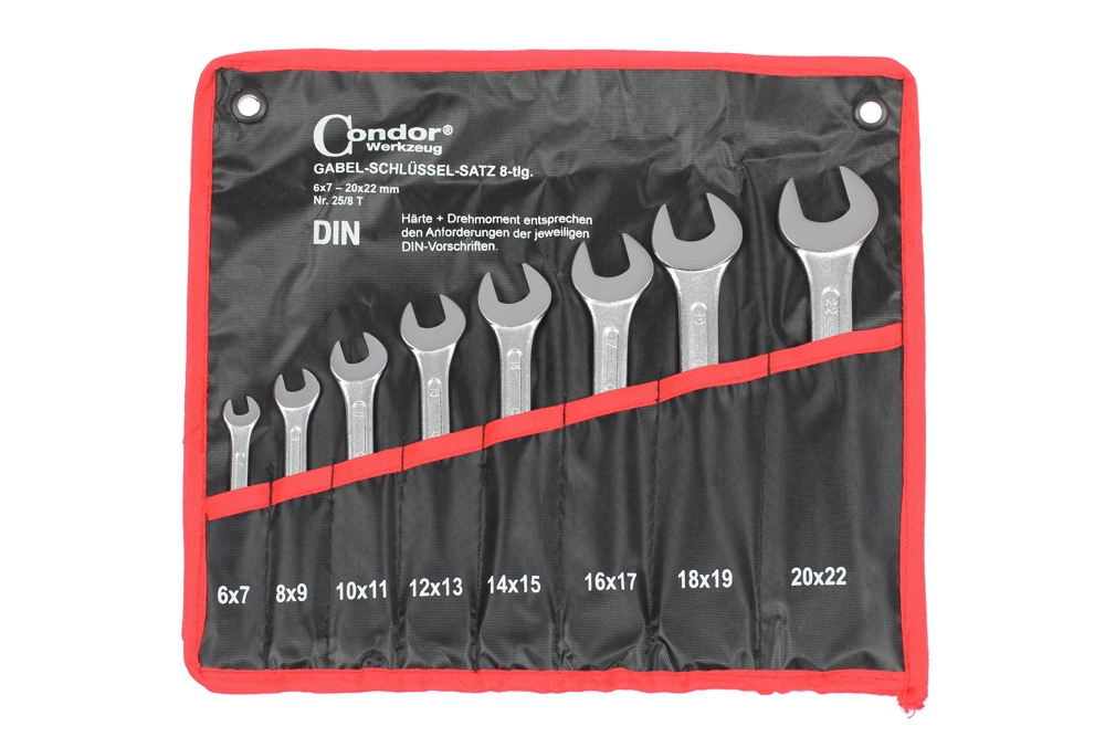 Kľúče sú vyrobené z jedného kusu kvalitnej legovanej chróm-vanádiovej ocele a sú pochrómované pre vyššiu povrchovú tvrdosť a odolnosť voči korozívnym vplyvom. Ústie kľúčov je sklonené o 15° k osi kľúča. Sú ideálne na použitie v rôznych priemyselných odvetviach, ale svoje miesto si nájdu aj v každej remeselníckej alebo hobby dielni. *Vyrobené podľa normy DIN 3110 *Súprava obsahuje kľúče s rozmermi 6 x 7 - 8 x 9 - 10 x 11 - 12 x 13 - 14 x 15 - 16 x 17 - 18 x 19 - 20 x 22 mm *Dodávané v textilnej taške v roli