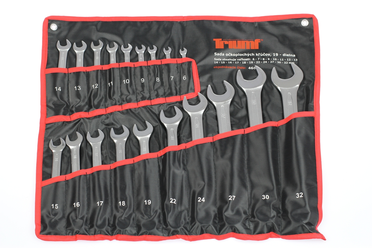 Klíče jsou vyrobeny kováním z jednoho kusu jakostní legované Chrom - Vanadiové oceli a povrchově upraveny chromem pro vyšší povrchovou tvrdost a odolnost vůči korozivním vlivům. Ústí klíčů je vykloněno o 15° oproti ose klíče a 12ti hranné očko je vyhnuto o 15°. Ideální pro použití v různých odvětvích průmyslu, své místo naleznou i v každé řemeslné i hobby dílně. *vyrobeno dle normy DIN 3113 *sada obsahuje klíče rozměrů 6 - 7 - 8 - 9 - 10 - 11 - 12 - 13 - 14 - 15 - 16 - 17 - 18 - 19 - 20 - 22 - 24 - 27 - 30 - 32 mm *dodáváno v textilní rolovací tašce