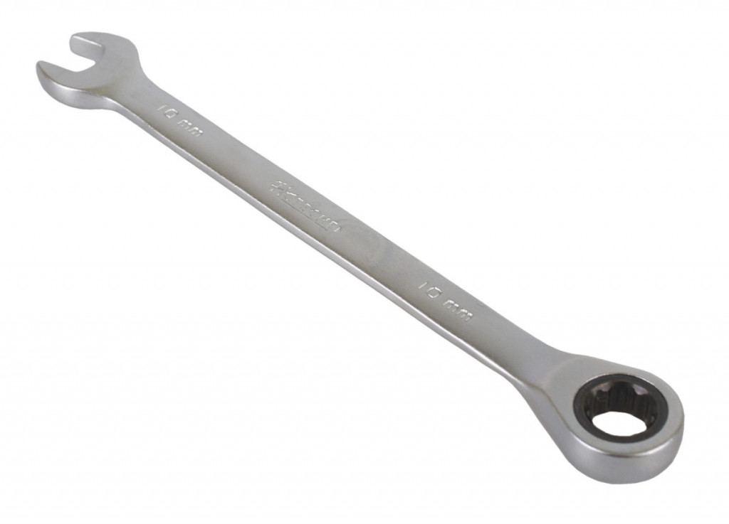 Ráčnový očkoplochý klíč od značky Hoteche o rozměru 10 mm je na jedné straně klasický stranový klíč, na straně druhé očkový klíč s dvanáctihranným profilem vybaveným ráčnou s jemným dělením 72 zubů. Povrch klíče je pochromovaný.