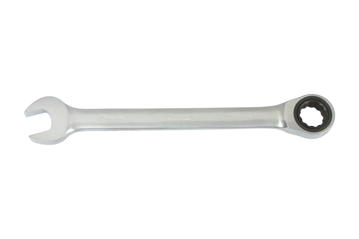 Ráčnový očkoplochý klíč je opatřen na jedné straně klasickým plochým otevřeným klíčem, na druhé straně 12ti hranným očkem s ráčnovým mechanizmem. Klíč je vyroben z Chrom-Vanadiové oceli a povrchově upraven matným chromem pro vyšší povrchovou tvrdost a odolnost vůči korozivním vlivům. Díky ráčnovému očku je ideální a nepřekonatelný při použití v těžko dostupných místech. Své uplatnění nalezne především v autoopravárenství, jakož i v ostatních průmyslových odvětvích i hobby dílnách. *řáčnové očko 72 zubů *rozměr 13 mm *délka 176 mm